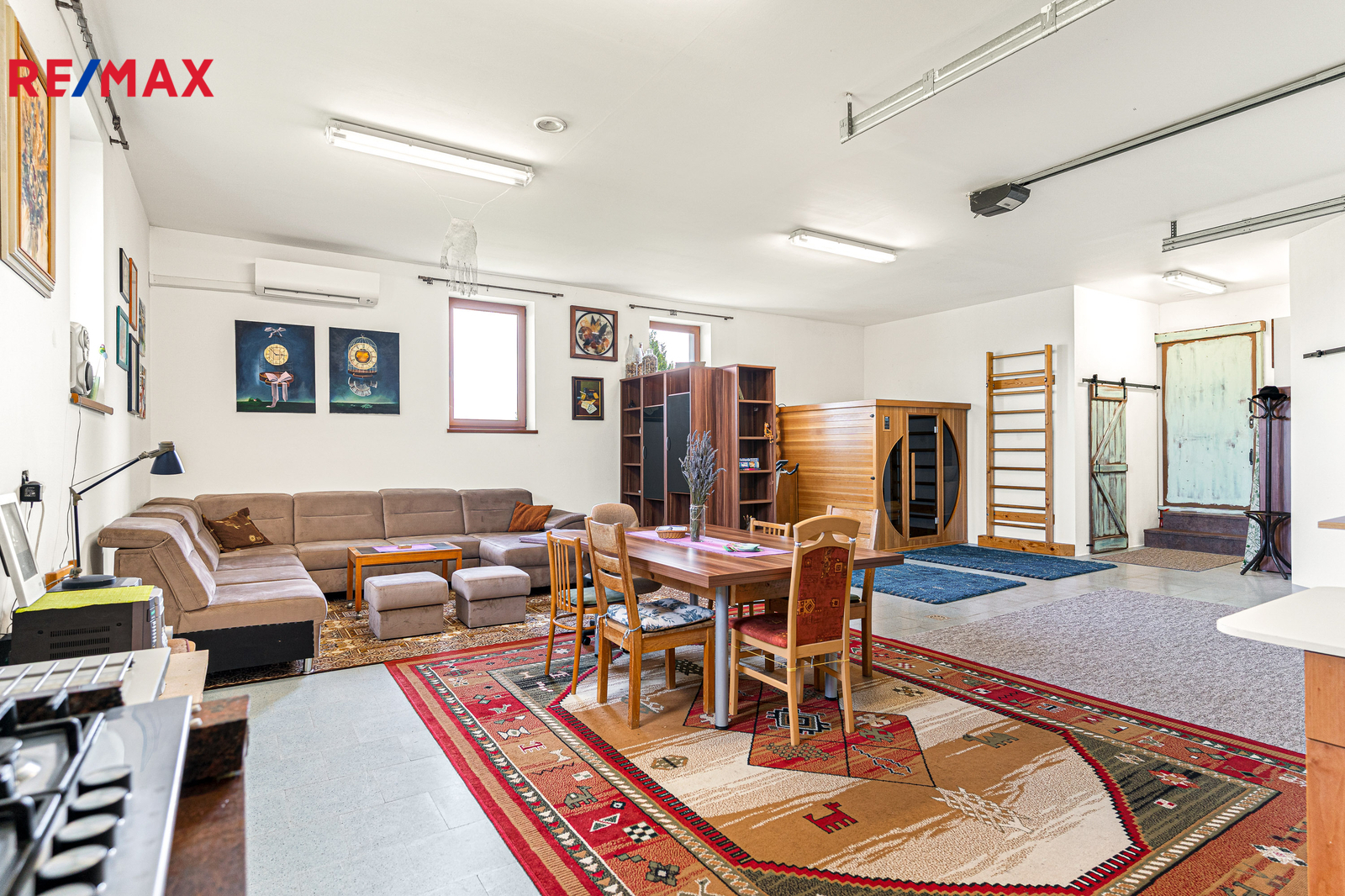 o Víceúčelová hala (95 m²) s výškou stropu cca 3,3 m – ideální pro např. autoservis, dílnu, sklad, parkování obytného vozu či podnikání