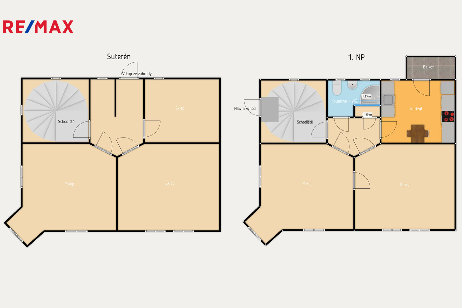 Suterén má samostatný vchod také ze zahrady. Je zde předsíň a 3 sklepní místnosti (původně sklep, prádelna a sklad potravin).