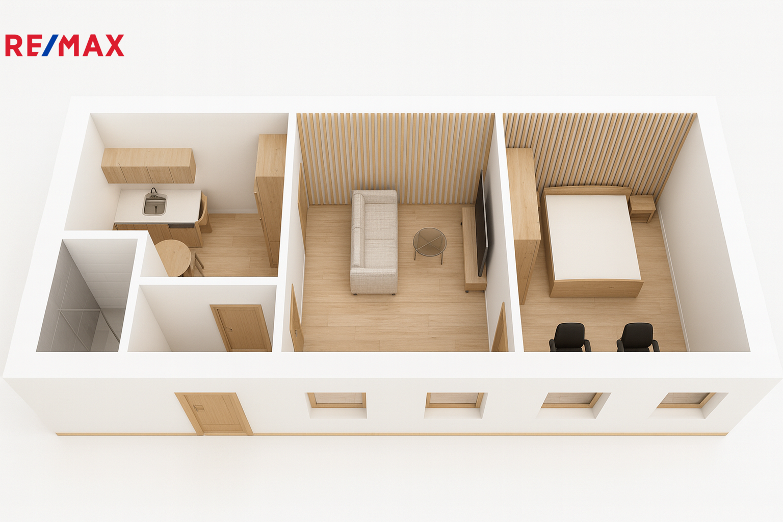 Současná dispozice nabízí vstupní předsíň, prostorný obývací pokoj oddělený částečnou příčkou od ložnice, samostatnou kuchyni se spotřebiči a koupelnu se sprchovým koutem a WC.