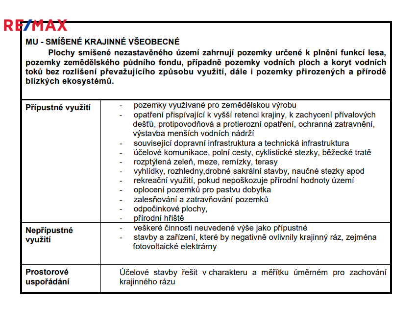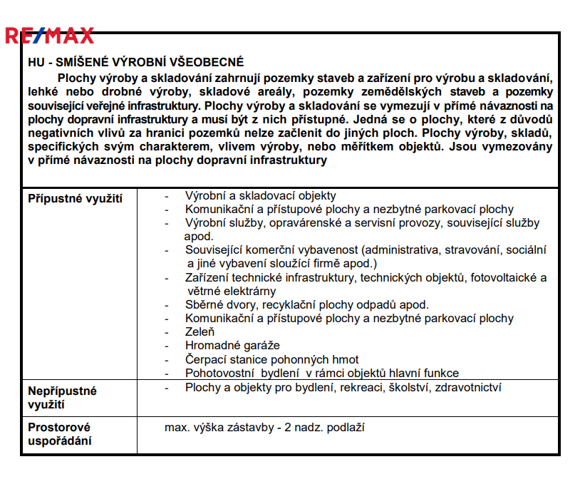 Přípustné využití ploch HU - Výrobní a skladovací objekty; Komunikační a přístupové plochy a nezbytné parkovací plochy; Výrobní služby, opravárenské a servisní provozy, související služby apod.; Související komerční vybavenost (administrativa, stravování, sociální a jiné vybavení sloužící firmě apod.); Zařízení technické infrastruktury, technických objektů, fotovoltaické a větrné elektrárny; Sběrné dvory, recyklační plochy odpadů apod.; Komunikační a přístupové plochy a nezbytné parkovací plochy; Zeleň; Hromadné garáže; Čerpací stanice pohonných hmot; Pohotovostní bydlení v rámci objektů hlavní funkce.