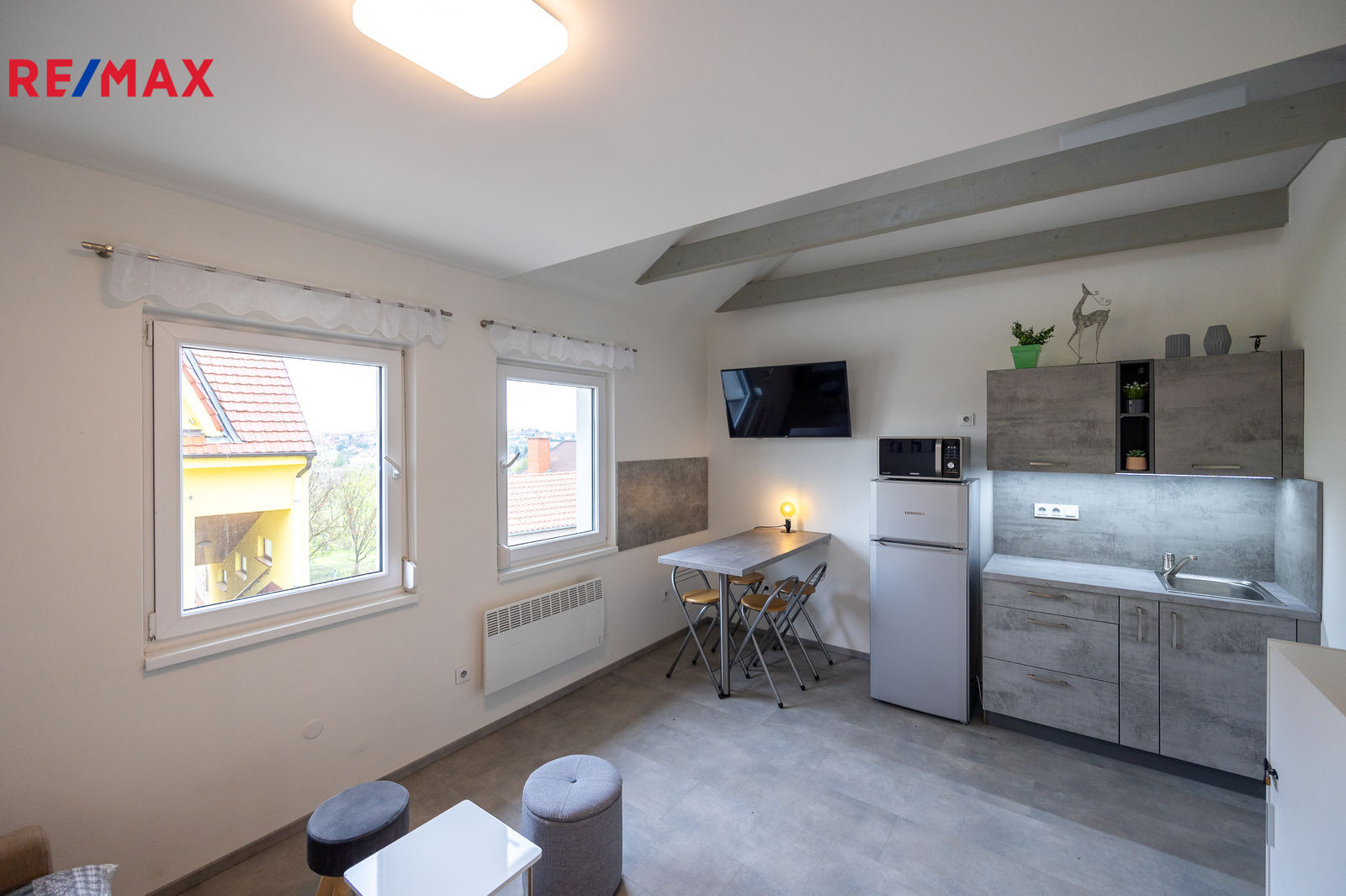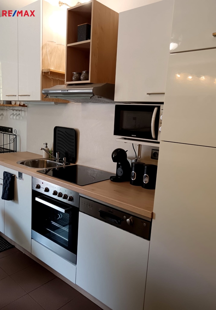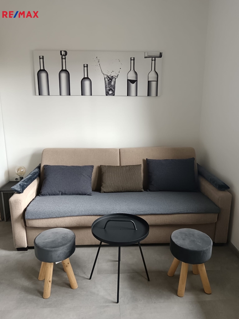 Apartmán je připraven k okamžitému užívání – najdete zde rozkládací gauč pro každodenní spaní, TV, jídelní stůl s barovými židlemi a moderní kuchyňský kout vybavený vším potřebným: dřezem, varnou konvicí, indukčním vařičem, mikrovlnnou troubou i prostornou lednicí s mrazákem.