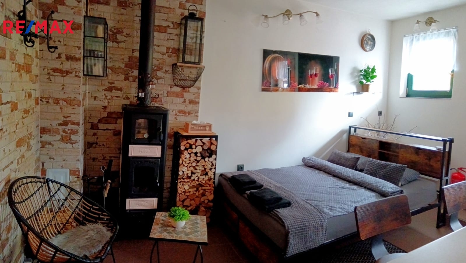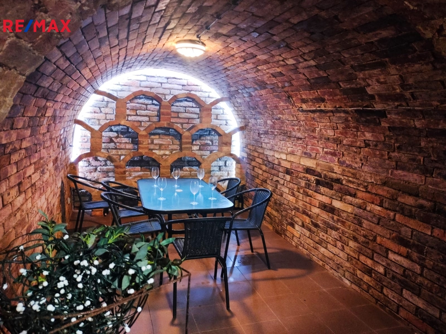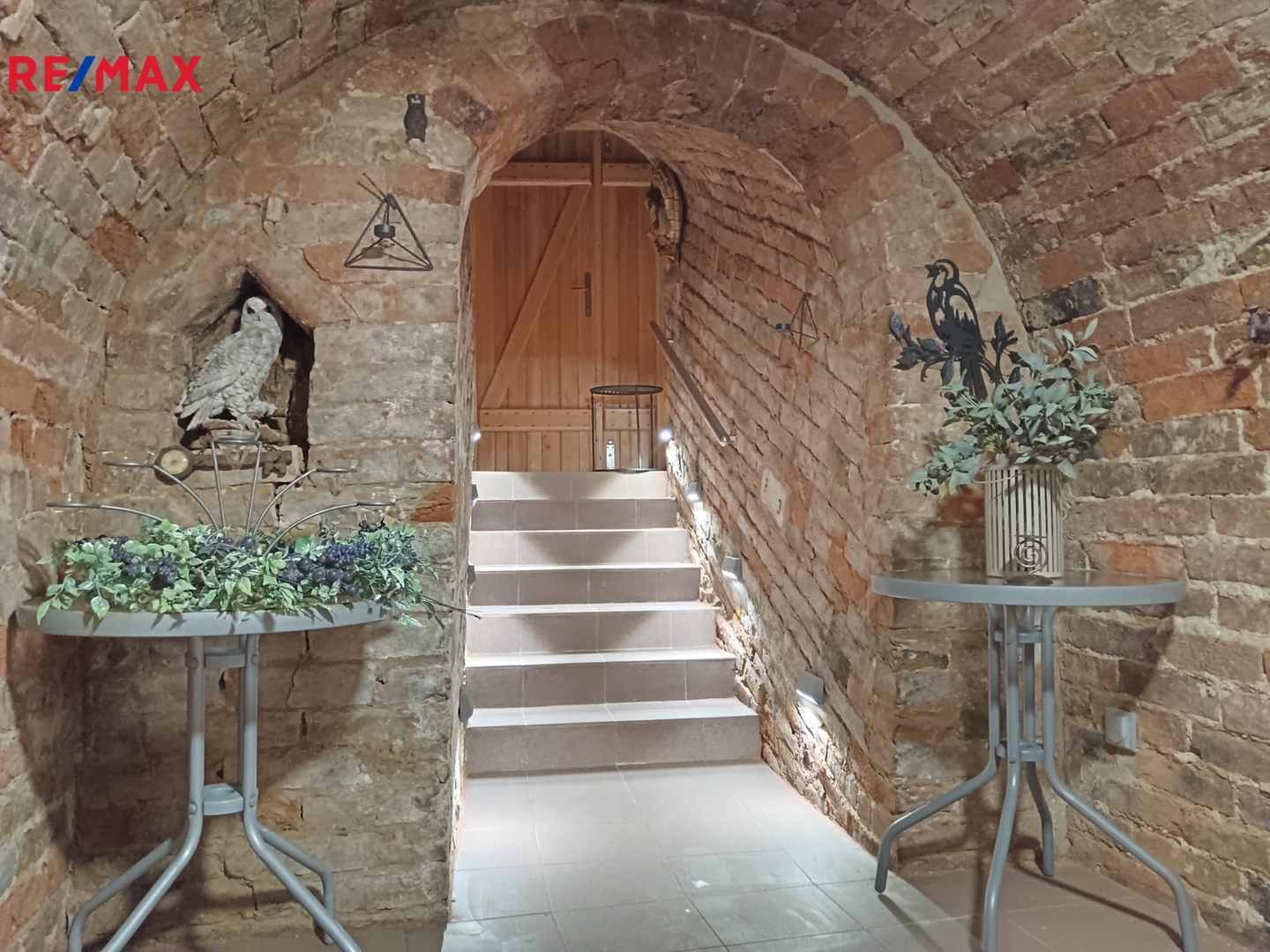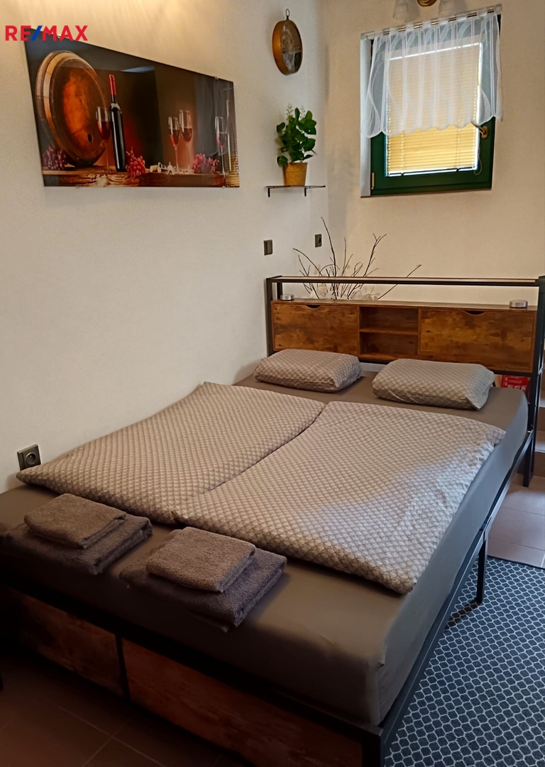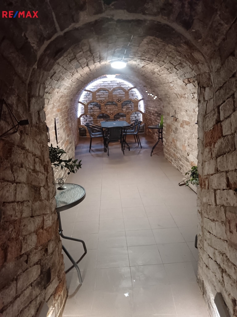 Součástí nabídky je i originální vinný sklípek přímo pod apartmánem. Původní lisovna byla přestavěna na útulnou obytnou místnost s vlastním barem, plně vybavenou kuchyní (lednice, mrazák, myčka, varná deska) a stylovým posezením. V zimě zde vykouzlí nezaměnitelnou atmosféru italská kamna na dřevo. Tento prostor je zcela nezávislý na apartmánu a nabízí skvělé možnosti – od romantických večerů až po podnikatelské využití. K dispozici je také koupelna s toaletou, pračka a manželská postel.