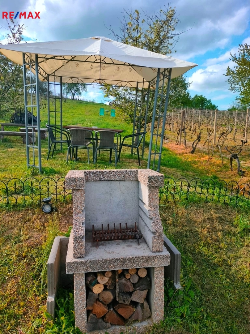 Součástí je i rozsáhlý pozemek o velikosti cca 1 800 m², částečně osazený vinnou révou. Vinici můžete sami opečovávat a těšit se z vlastní úrody, nebo ji ponechat v péči místních vinařů, kteří se postarají o vše potřebné.