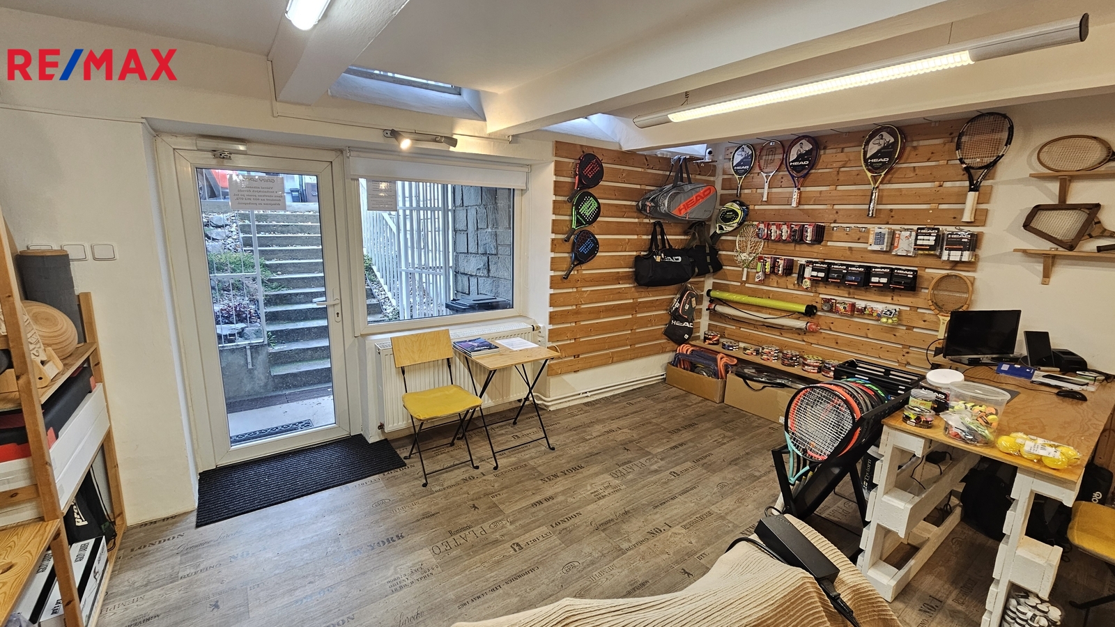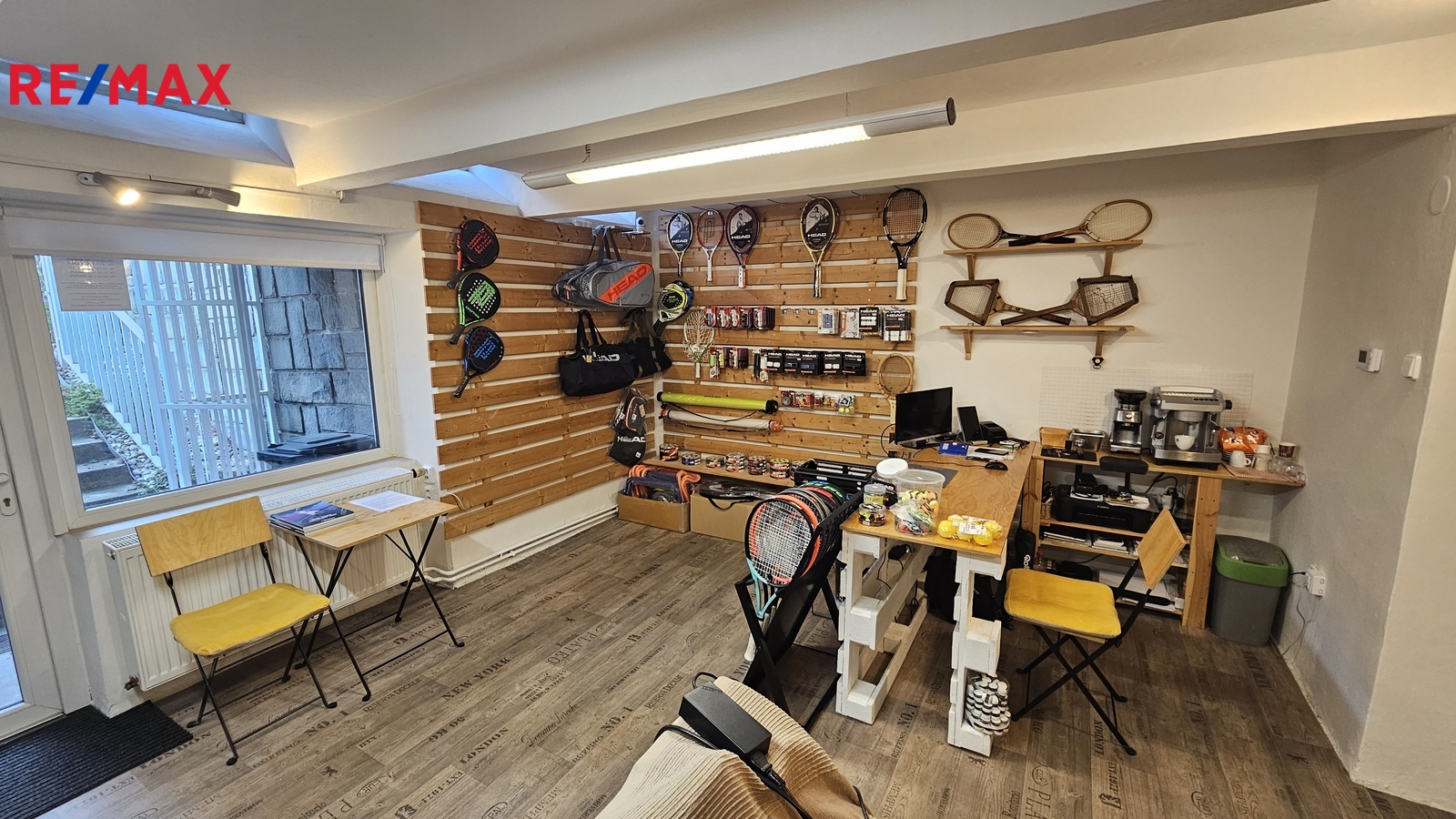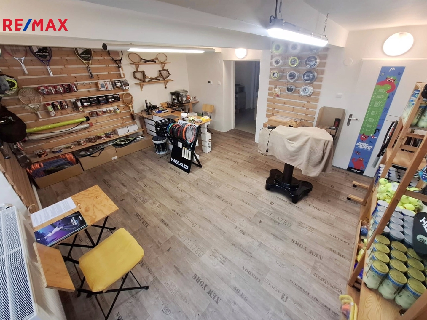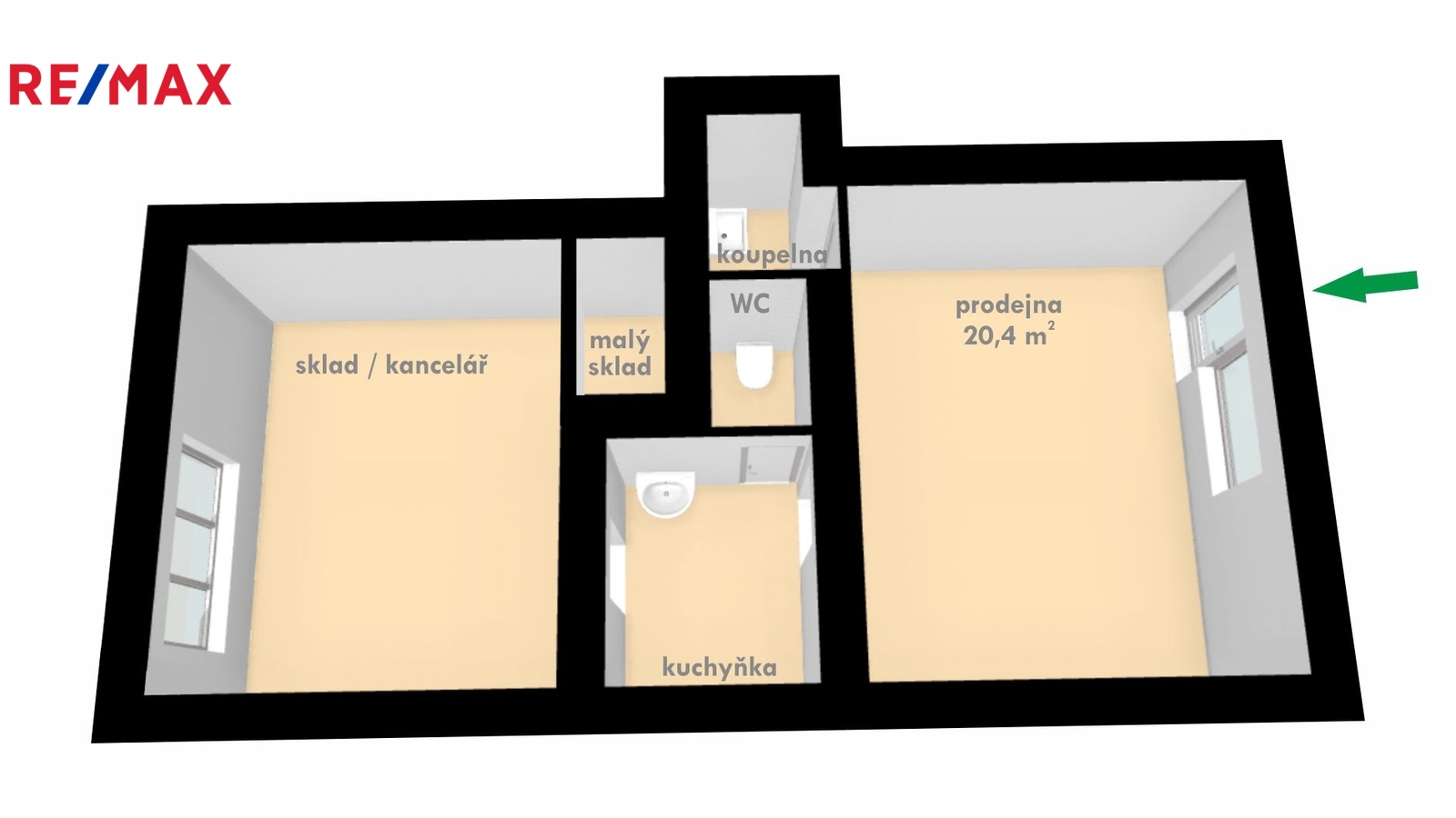 Hlavní prodejní plocha je 20,4 m2, vedlejší místnost (sklad) má 15,6 m2.