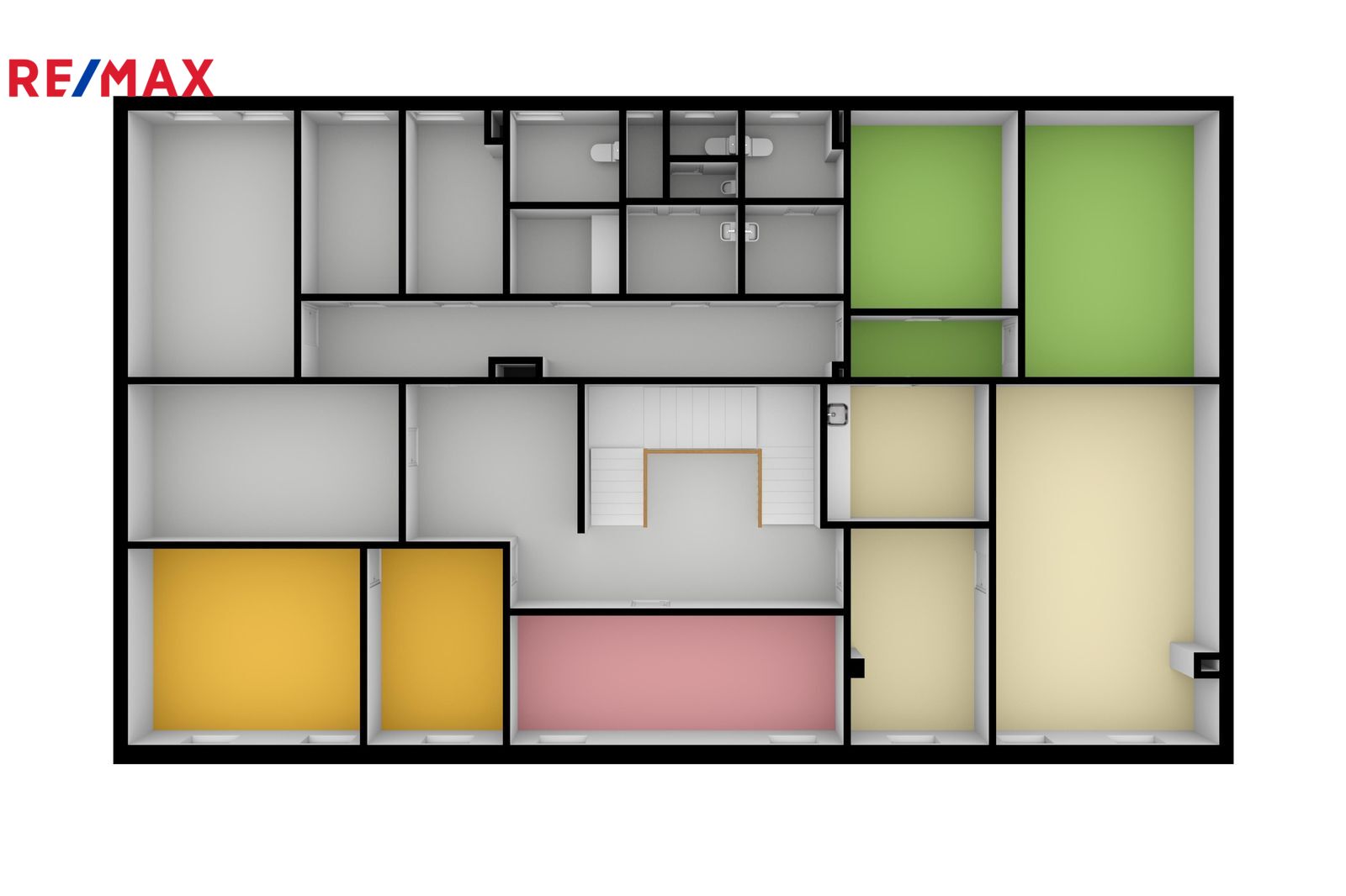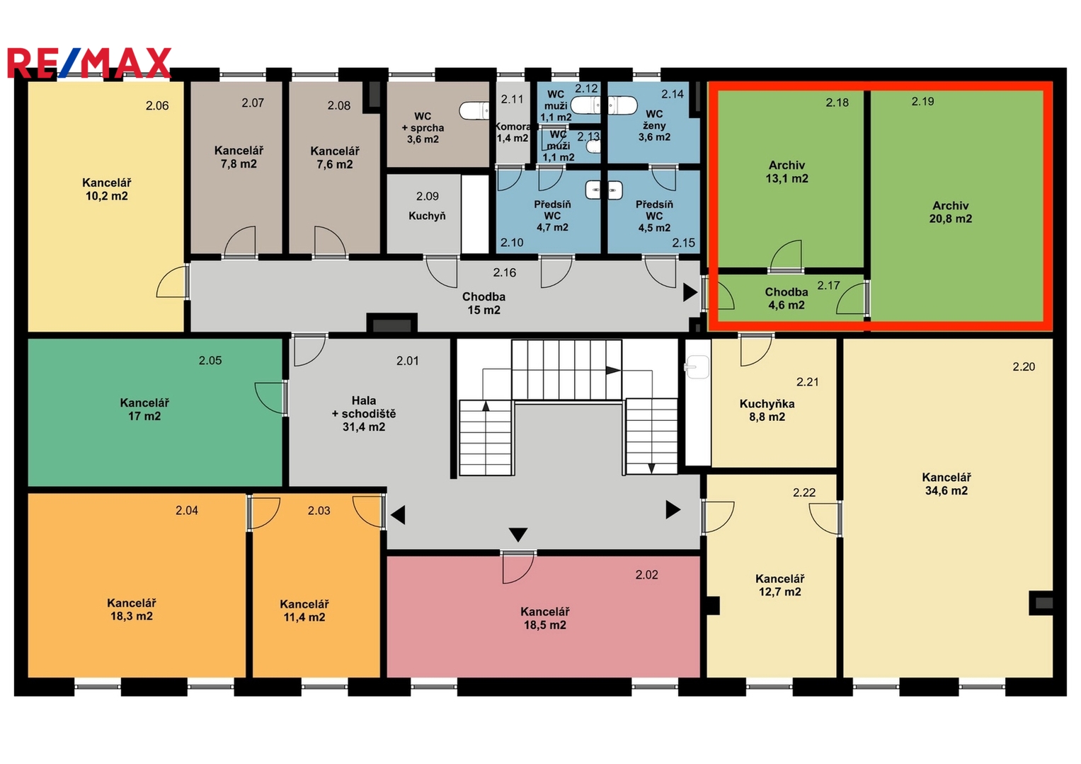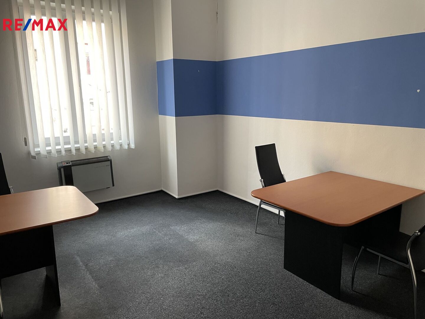 Kancelář se nachází v prvním NP, rozměry jsou: chodba 4,6 m2, místnost 13,1 m2 a druhá místnost 20,8 m2. Sociální zázemí na chodbě, odděleně dámské a pánské.