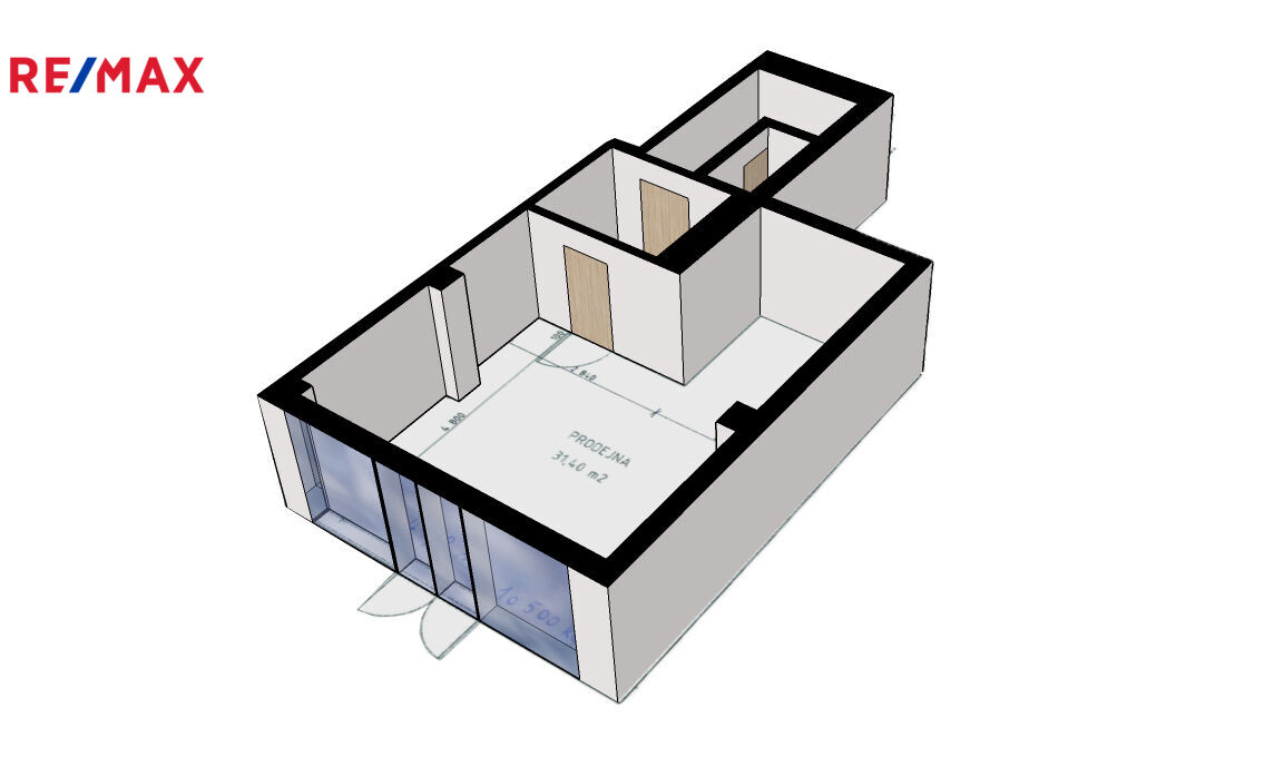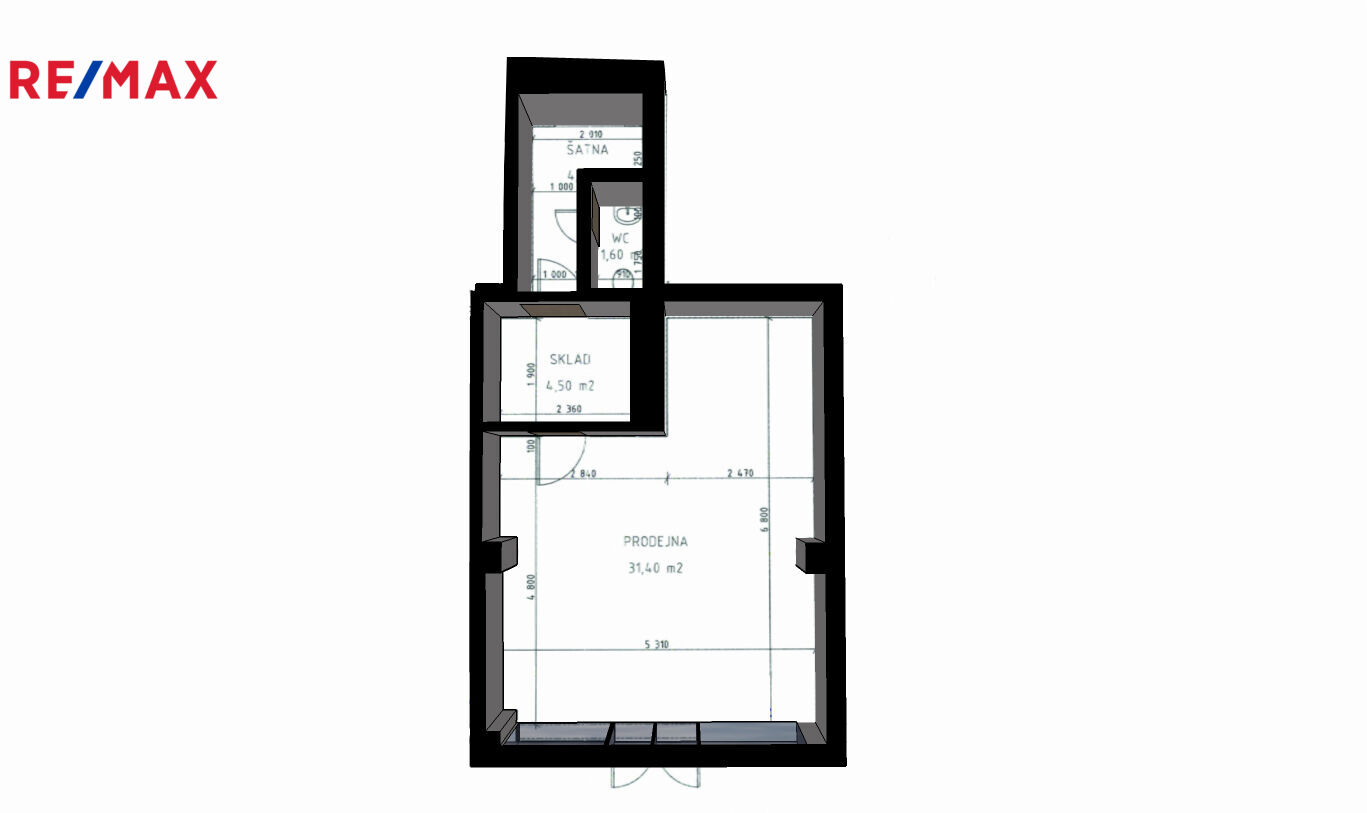 Prodejní plocha je 31,4 m2 + sklad 4,5 m2, + sociální zázemí.