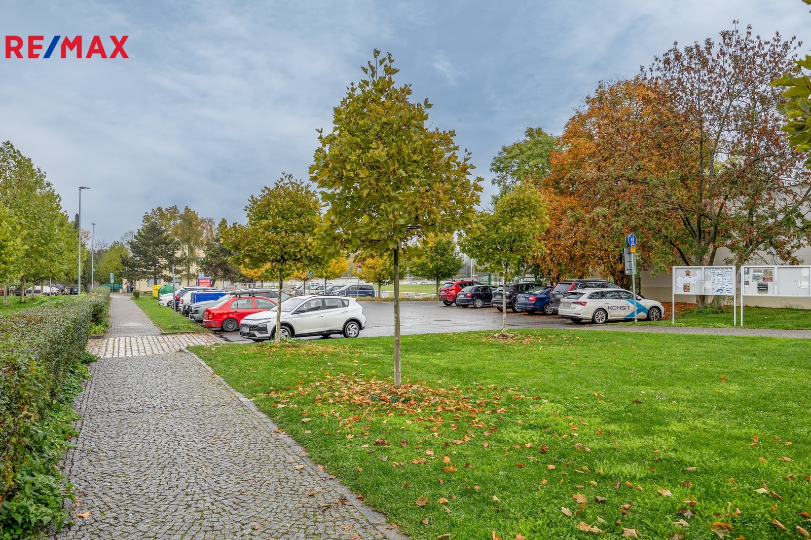 Před budovou je autobusová zastávka, vedle fotbalové hřiště a dvě parkoviště.