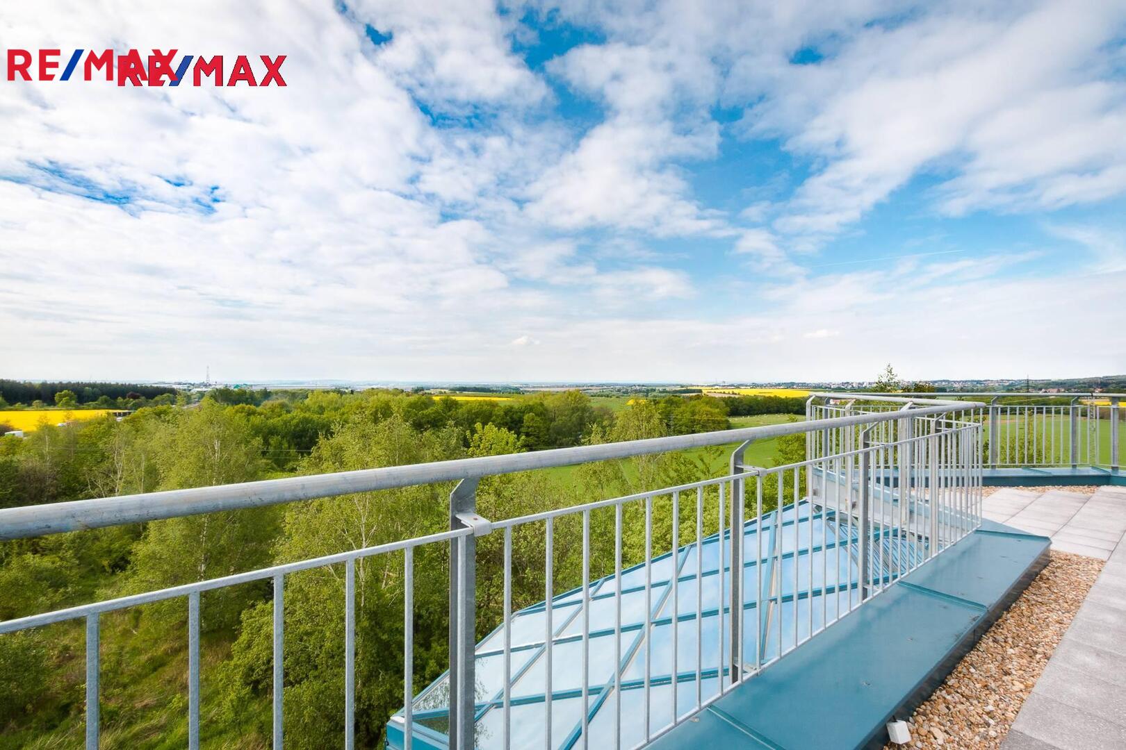 - moderní třípodlážní administartivní budovy (1245 m2) s recepcí, školící místností, kuchyňkami v každém podlaží, dvěma hotelovými pokoji, terasami s výhledem na Prahu a široké panorama okolní krajiny.