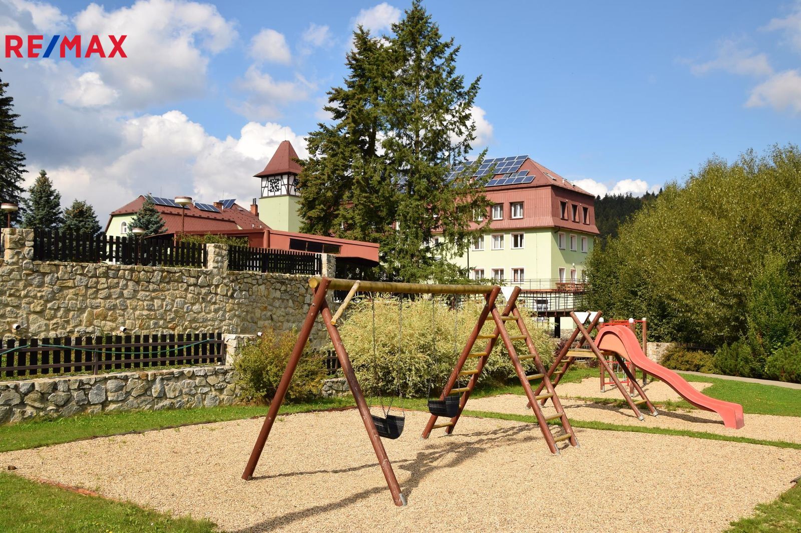 • dětské hřiště, altán, kuželky, jezírko a potok
