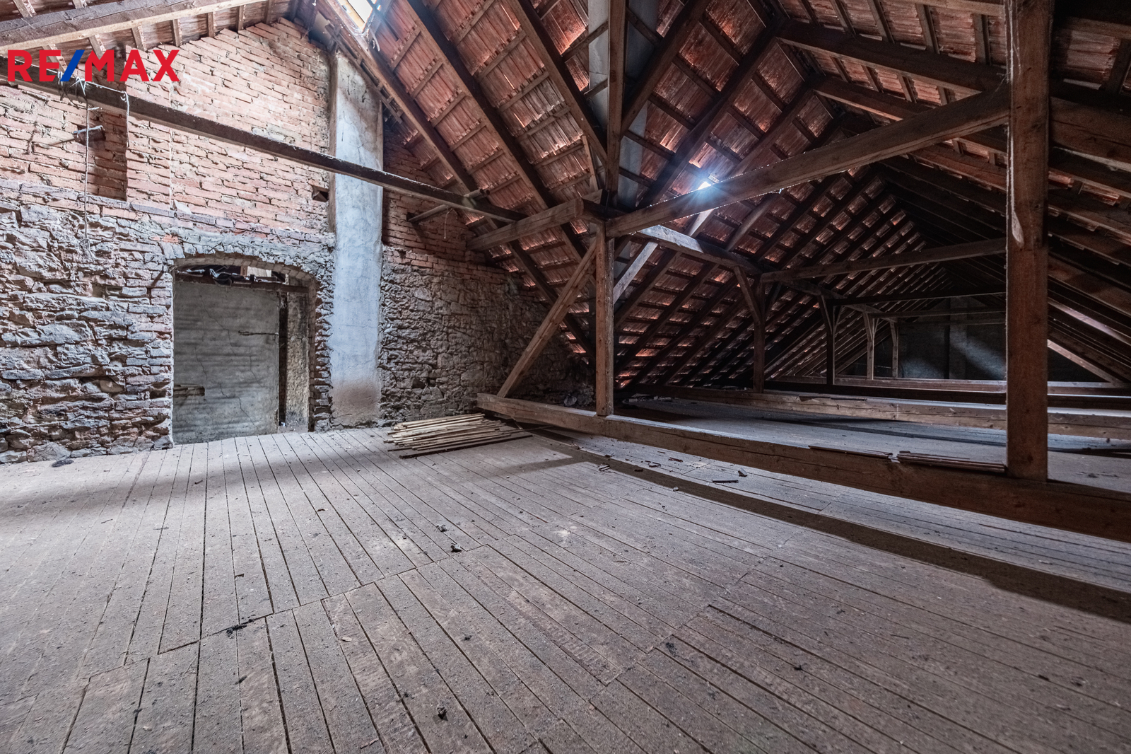 Podkroví domu je v současnosti určeno k rekonstrukci a nabízí velký potenciál pro vybudování nájemních bytů či ubytovacích kapacit.