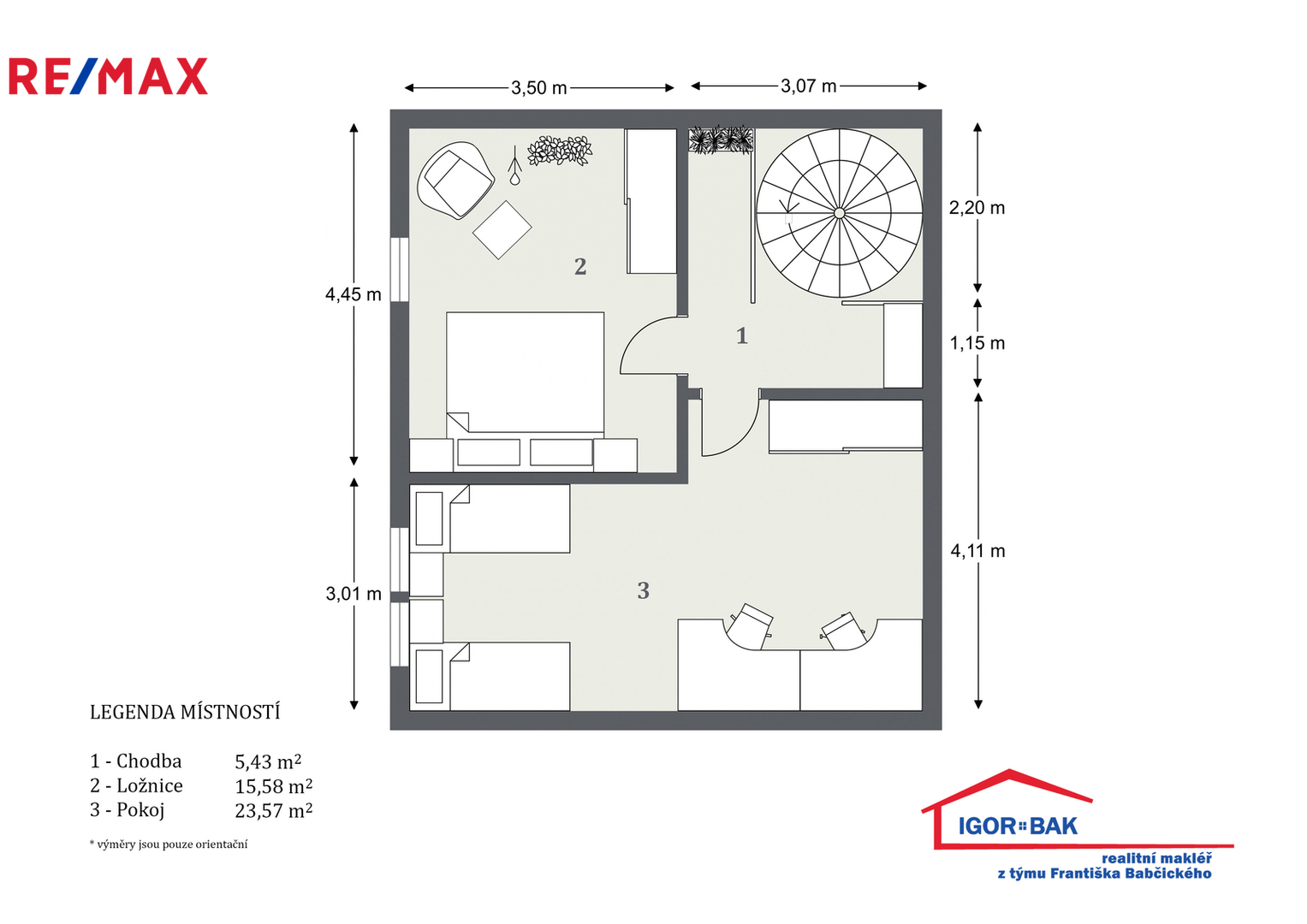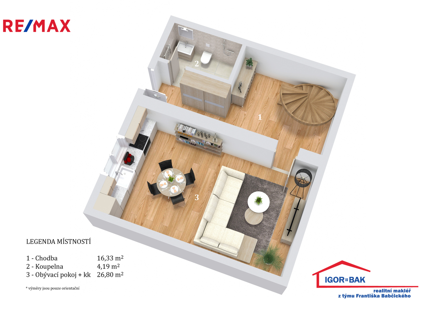 První jednotkou je rohový mezonet 3+kk o podlahové ploše 114 m² s pozemkem o výměře 49 m² a předzahrádkou 15 m², která je pronajata od obce. V přízemí se nachází kuchyně, obývací pokoj a koupelna s exkluzivní dlažbou. V patře jsou dvě ložnice a chodba. Byt je vybaven vinylovými podlahami, kvalitními střešními okny Velux s trojskly, samostatným měřením a jímkou o objemu 9 m³. Parkování je možné před domem.