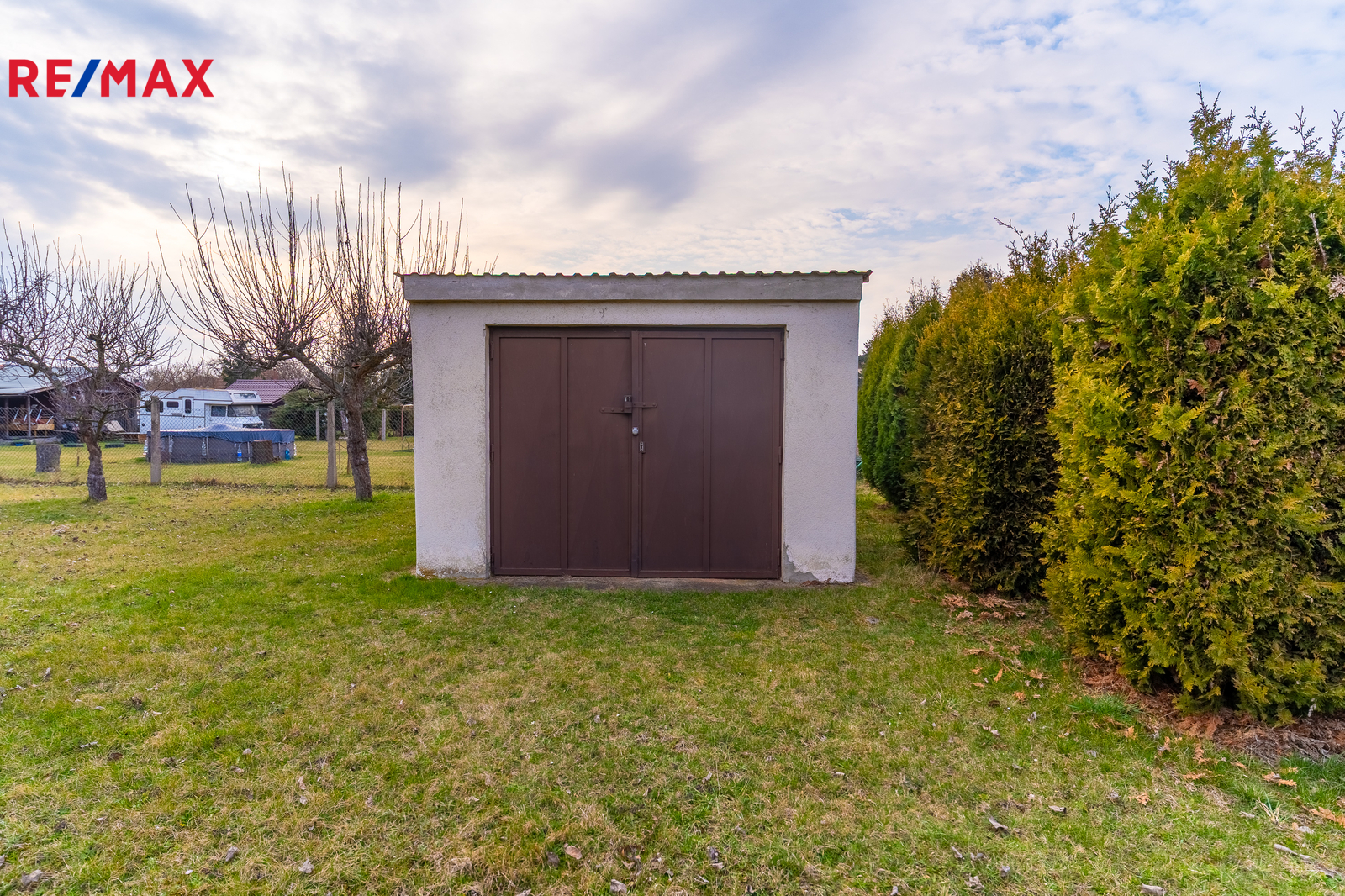 Příjezd k pozemku vede po zpevněné cestě. Na kraji parcely stojí prostorná garáž.