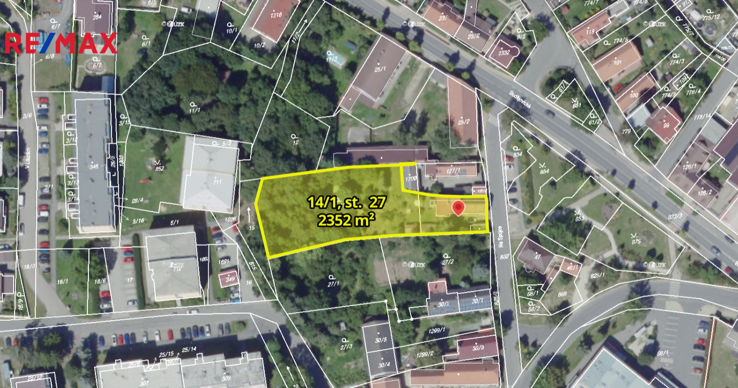 Navazující pozemek parc. č. 14/1 o výměře 1 860 m² se nachází v ploše obecně obytné (BO). Je určen primárně pro výstavbu rodinných domů a nabízí možnost rozdělení na dvě samostatné stavební parcely, případně realizaci dvojdomu. Koeficient zastavění je zde maximálně 40 %, minimální podíl zeleně činí 50 % a maximální výška zástavby je 10,5 metru. Pro budoucí obsluhu rodinných domů je nutné vybudování nové přístupové komunikace.
