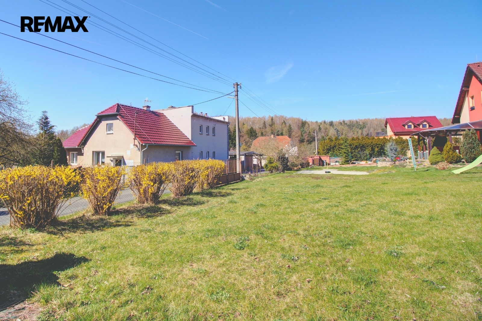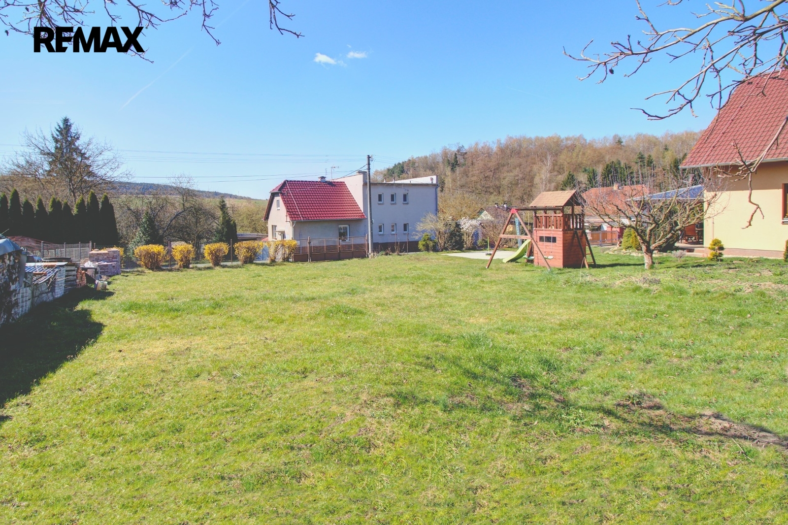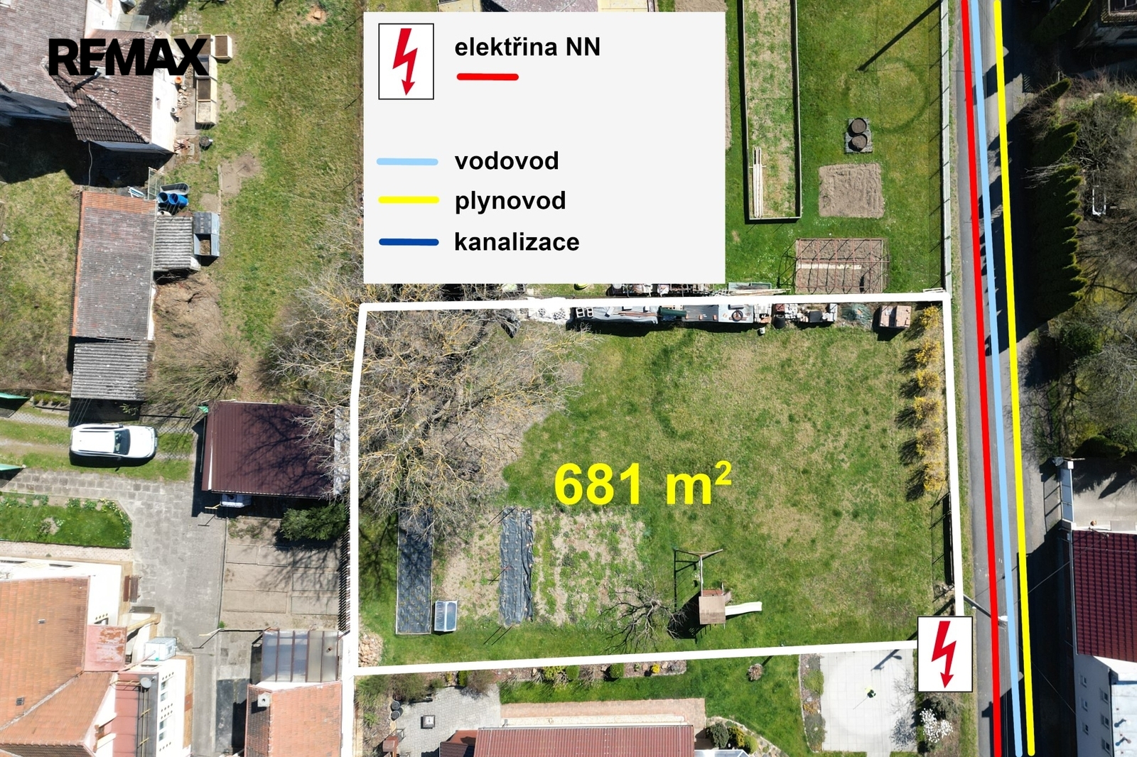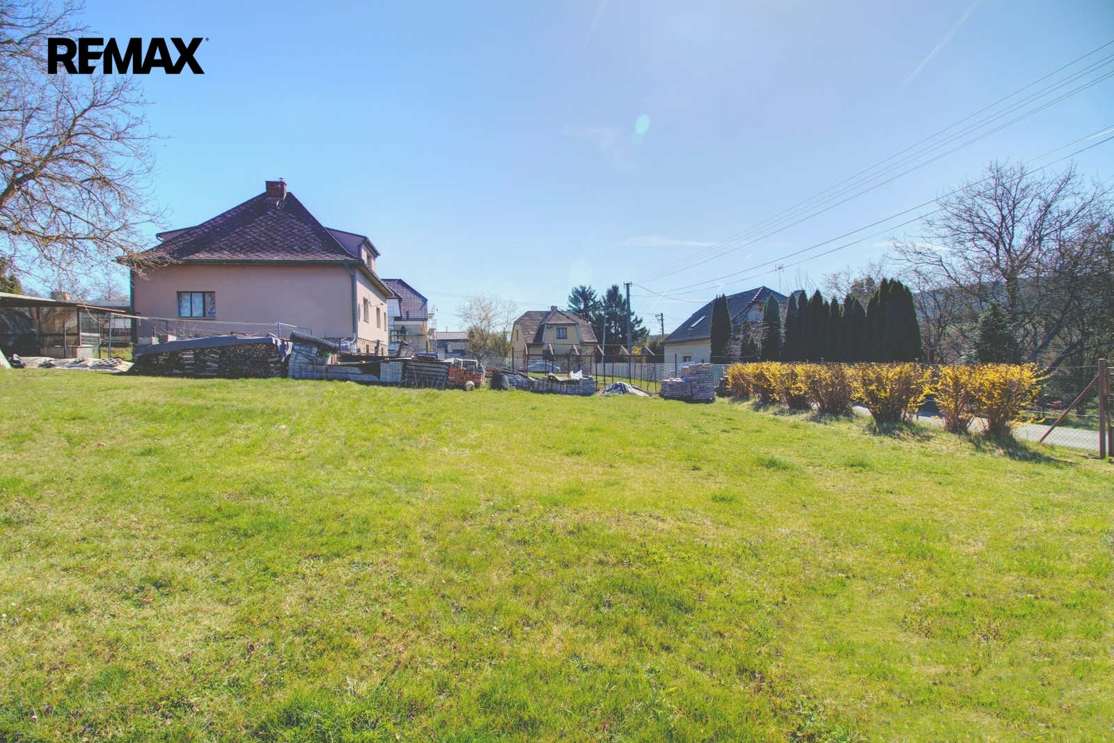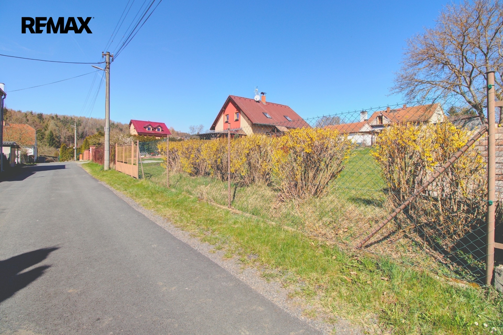 Pozemek je ze tří stran oplocen. K dispozici budete mít široký vjezd s bránou i vstupní branku. Oceníte bezproblémový příjezd po asfaltové obecní komunikaci.
