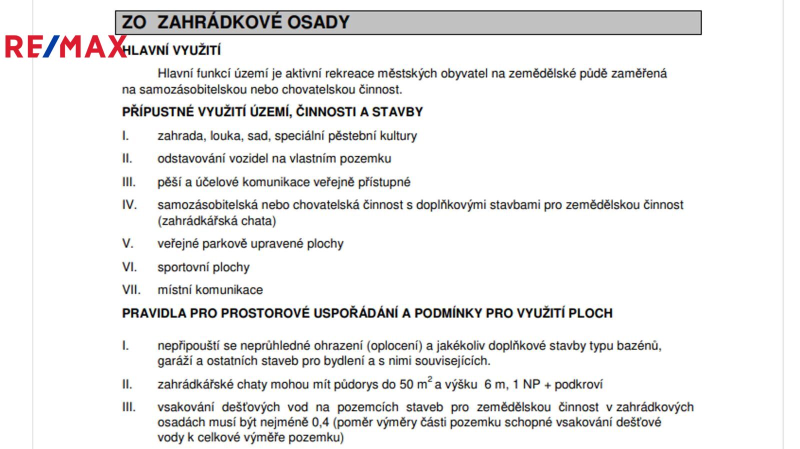 • Možnost výstavby chaty o zastavěné ploše až 50 m² a výšce 6 metrů (1 NP + podkroví).