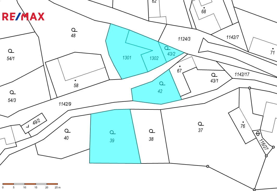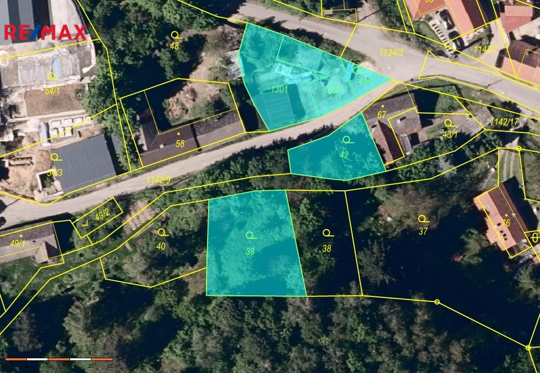 Pozemky se sestávají z pěti parcel, z toho 3 parcely jsou uceleného celku o výměře 482 m2 a naproti jsou 2 pozemky - zahrady o výměře 662 m2.