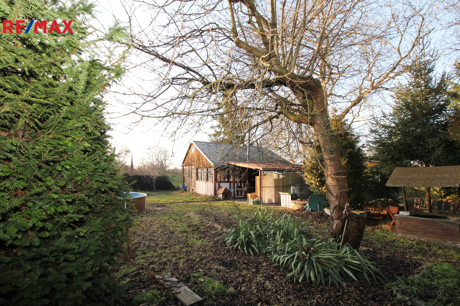 Na oplocené zahradě se nachází obytný vagón, který je napojen na el. energii, dále polozapuštěný bazén, zahradní přístřešek na dřevo a suché WC.