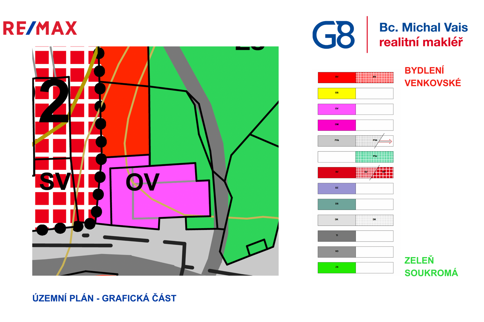 Zbývající část pozemku je vedena jako ZS – zeleň soukromá, tedy plocha vhodná pro zahradu, sad či užitkové pěstování. Tato kombinace dává budoucímu majiteli jasně vymezený stavební prostor a zároveň dostatek místa pro relaxaci, pěstování nebo drobné zahradní stavby související s užíváním pozemku.