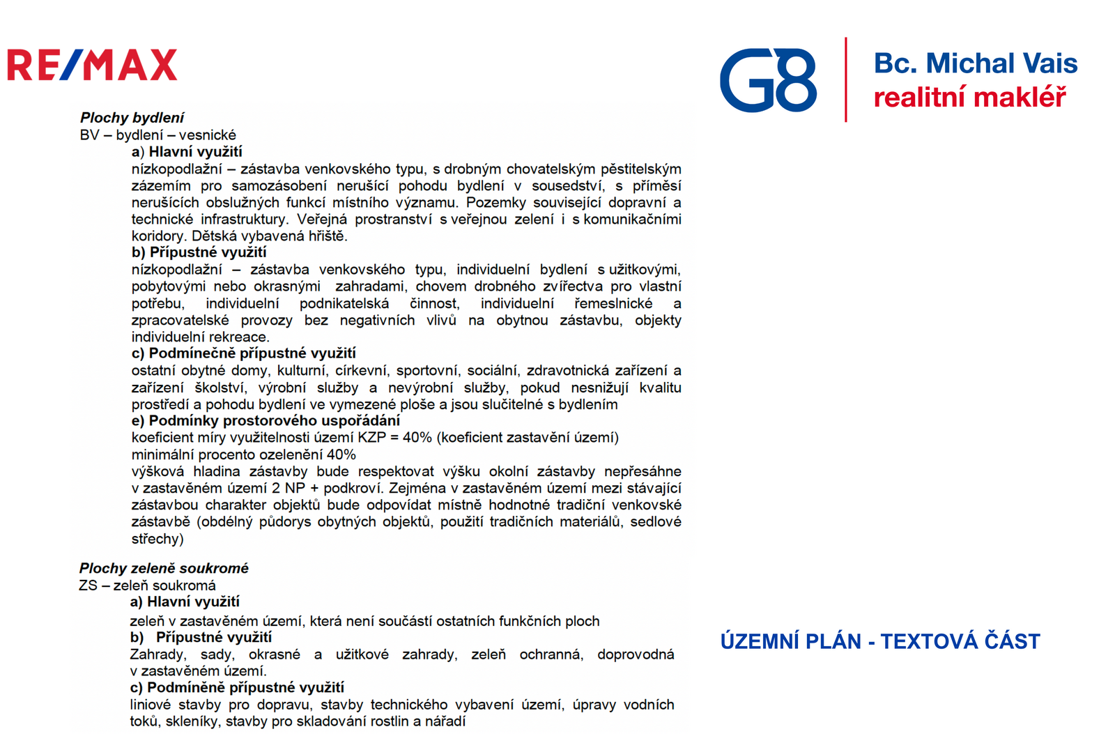 Dle územního plánu je část pozemku určena jako BV – bydlení vesnické, což umožňuje realizaci nízkopodlažní zástavby venkovského typu s maximálně 2 nadzemními podlažími a podkrovím. Koeficient zastavění činí 40 % a minimální podíl zeleně 40 %, což přirozeně podporuje koncept rodinného bydlení s dostatkem zahrady a soukromí. Charakter stavby by měl respektovat tradiční venkovskou architekturu (např. sedlová střecha, obdélný půdorys).