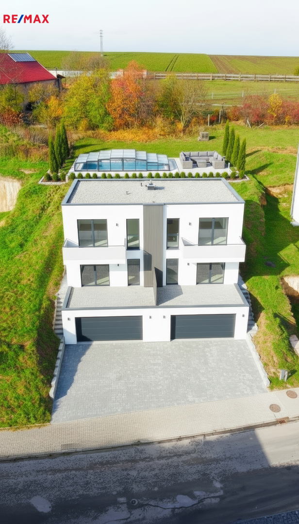Pozemek je situován ve svažitém terénu, díky čemuž nabízí pěkný výhled a výborné možnosti pro architektonicky zajímavé řešení rodinného domu. Přístup je z hotové asfaltové komunikace a velkou výhodou je kompletní infrastruktura přímo v místě – k pozemku vedou všechny hlavní inženýrské sítě, včetně elektřiny, vodovodu, kanalizace i plynu. Podle územního plánu se tato lokalita profiluje jako moderní zóna rodinných domů, kde se běžně uplatňuje současná architektura s rovnou střechou. Díky tomu má celé území jednotný a velmi čistý urbanistický charakter, což zvyšuje hodnotu budoucí stavby i do budoucna.
