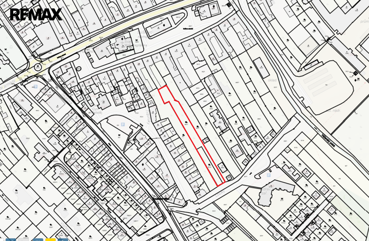 2 167 m², šíře parcely činí cca 12 až 14 metrů