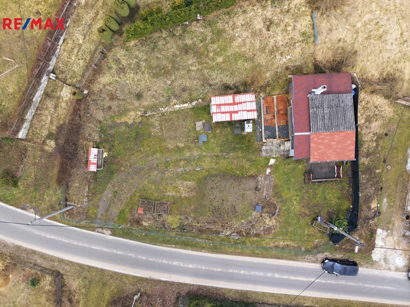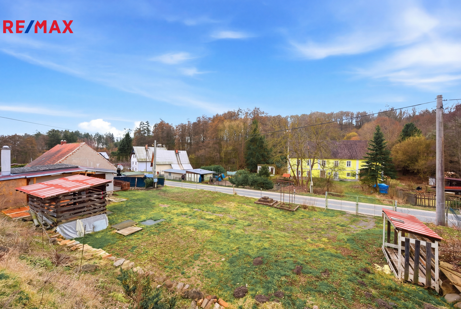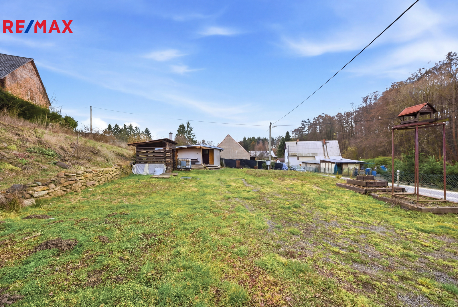 Na pozemku se nachází jednoduchá dřevěná chata, která je bez pevných základů a je umístěna na patkách. Do chaty je zavedena elektřina a odpady jsou řešeny jímkou o objemu 2 m³. Na pozemku se dále nachází zkušební vrt o hloubce 22 metrů, který může sloužit jako základ pro vlastní zdroj vody.