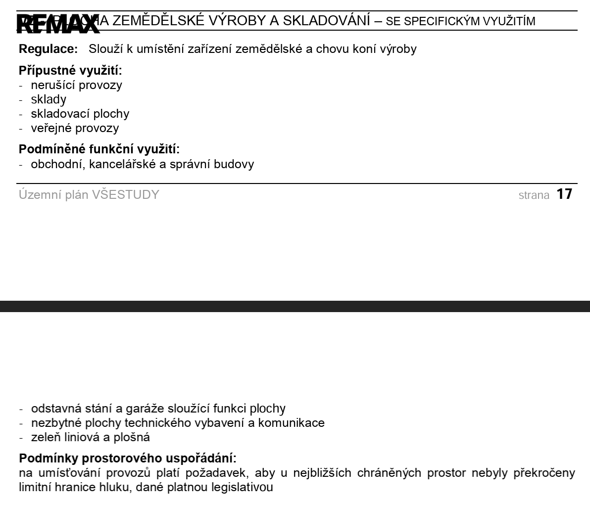 Dle územního plánu jsou pozemky určeny primárně pro výrobu (zemědělskou a lesnickou), s možností širšího využití včetně skladování, administrativy, veřejných provozů či doplňkových služeb.