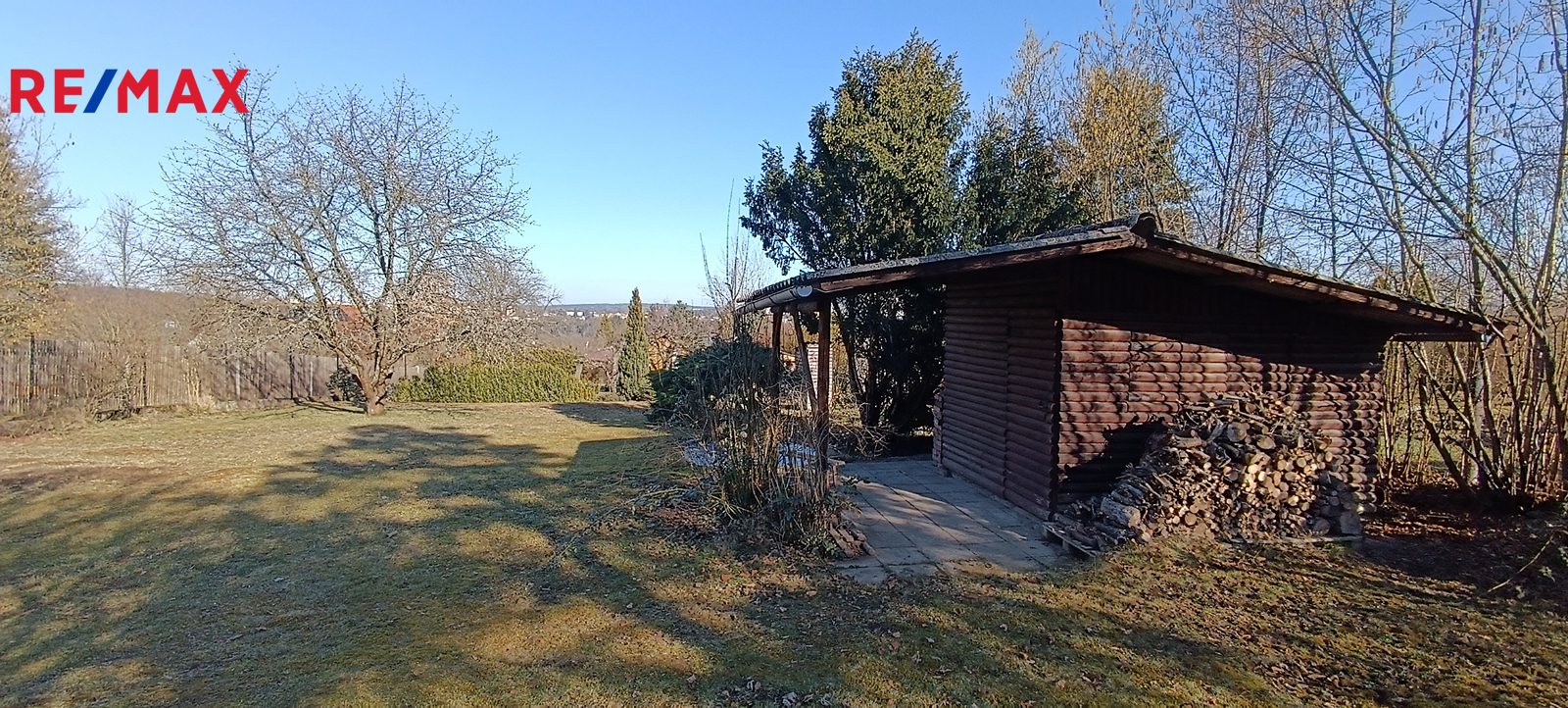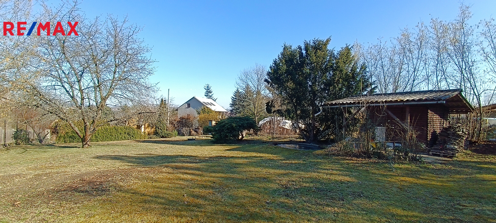 Součástí zahrady je dřevěná chatka, vhodná k uskladnění např. grilu, zahradní techniky a nářadí.